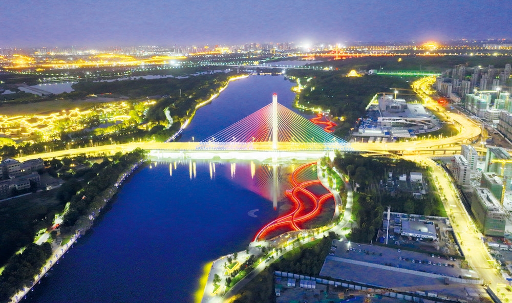 夏日夜晚,學(xué)府橋與復(fù)興大街滹沱河大橋交相輝映,景色迷人。首席記者 張 震 攝