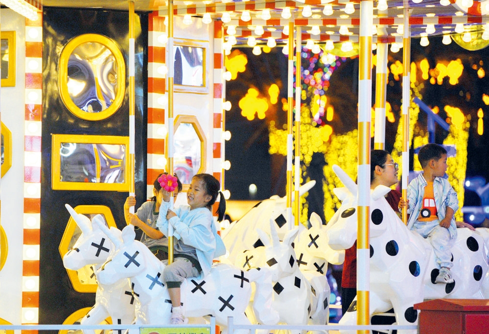 夜色中的灣里廟步行街游樂(lè)場(chǎng)霓虹閃爍,孩子們仿佛進(jìn)入童話般的世界。記者 郄 磊 攝