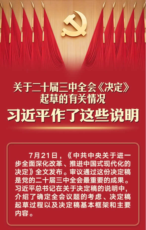 7月21日,《中共中央關(guān)于進(jìn)一步全面深化改革、推進(jìn)中國式現(xiàn)代化的決定》全文公開發(fā)布。受中央政治局委托,習(xí)近平總書記向黨的二十屆三中全會作關(guān)于《決定》的說明同時公布。 從征求和確定全會議題到起草文件、深入調(diào)查研究、廣泛征求意見、開展專題論證、反復(fù)討論修改,習(xí)近平總書記指出,決定稿錨定2035...