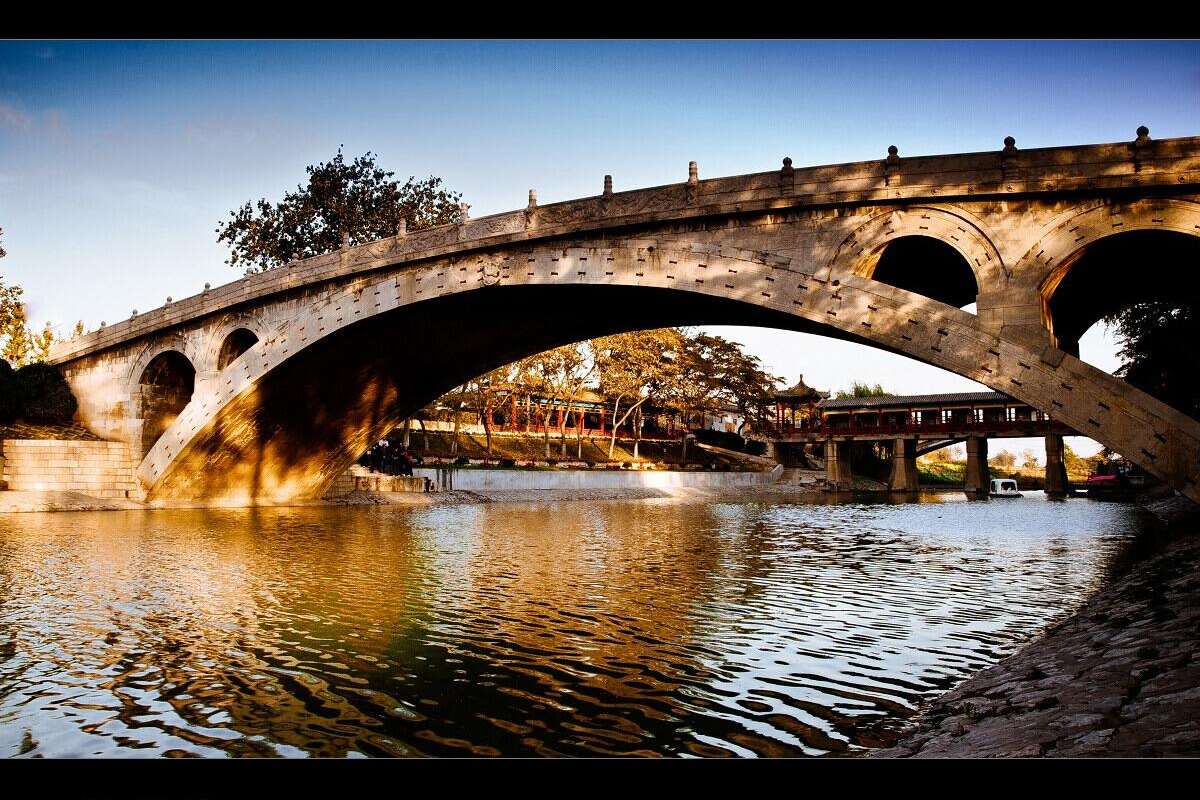 一般考證認(rèn)為,趙州橋大約建于隋代開皇年間(595-605年),由隋朝匠師李春設(shè)計建造,是迄今世界上現(xiàn)存最古老的石拱橋杰出的典型代表,自建成距今約在上下1400年間。石拱橋是用石塊拼砌成彎曲的拱作為橋身,上面修成平坦的橋面,以行車走人。而趙州橋的特點是“敝肩式”,即在大拱的兩肩上再辟小拱,是石拱橋結(jié)構(gòu)中最先進(jìn)的一種。它的坦拱敞肩式結(jié)構(gòu)在世界橋梁建筑史上首創(chuàng)并獨樹一幟,并對其后及當(dāng)今的橋梁建筑均產(chǎn)生了巨大而深遠(yuǎn)的影響。