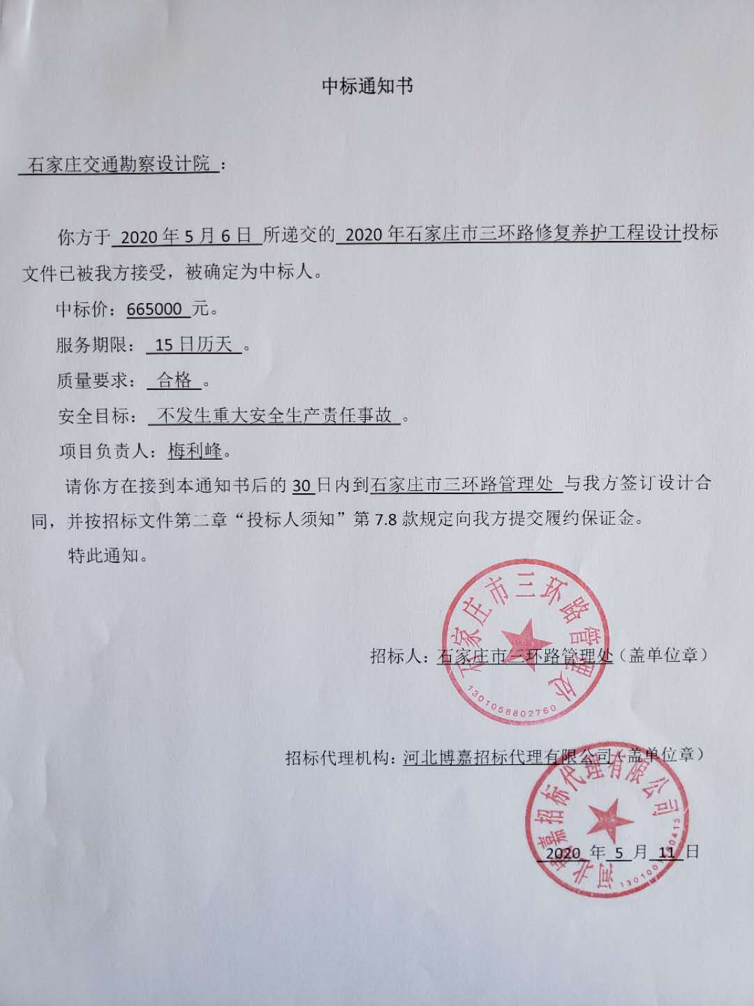 2020年石家莊市三環(huán)路修復養(yǎng)護工程設計中標通知書